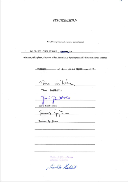 Useiden kirkon turnausten ja hyvän menestyksen jälkeen siirryimme kaudeksi 1994–1995 Riihimäen paikallissarjaan. Tuon tyydyttävän vuoden aikana päätimme toteuttaa vuosia kypsyneen haaveemme oman seuran perustamisesta, mikä toteutui huolellisten valmistelujen jälkeen 29.5.1995 Turengissa. Seuran nimeksi tuli äänestyksen jälkeen Salibandy Club Urbans. Seuran kotipaikaksi merkittiin Janakkala. S.C.Urbans perustavoitteeksi tuli kehittää ja edistää salibandytoimintaa Janakkalan kunnan alueella.